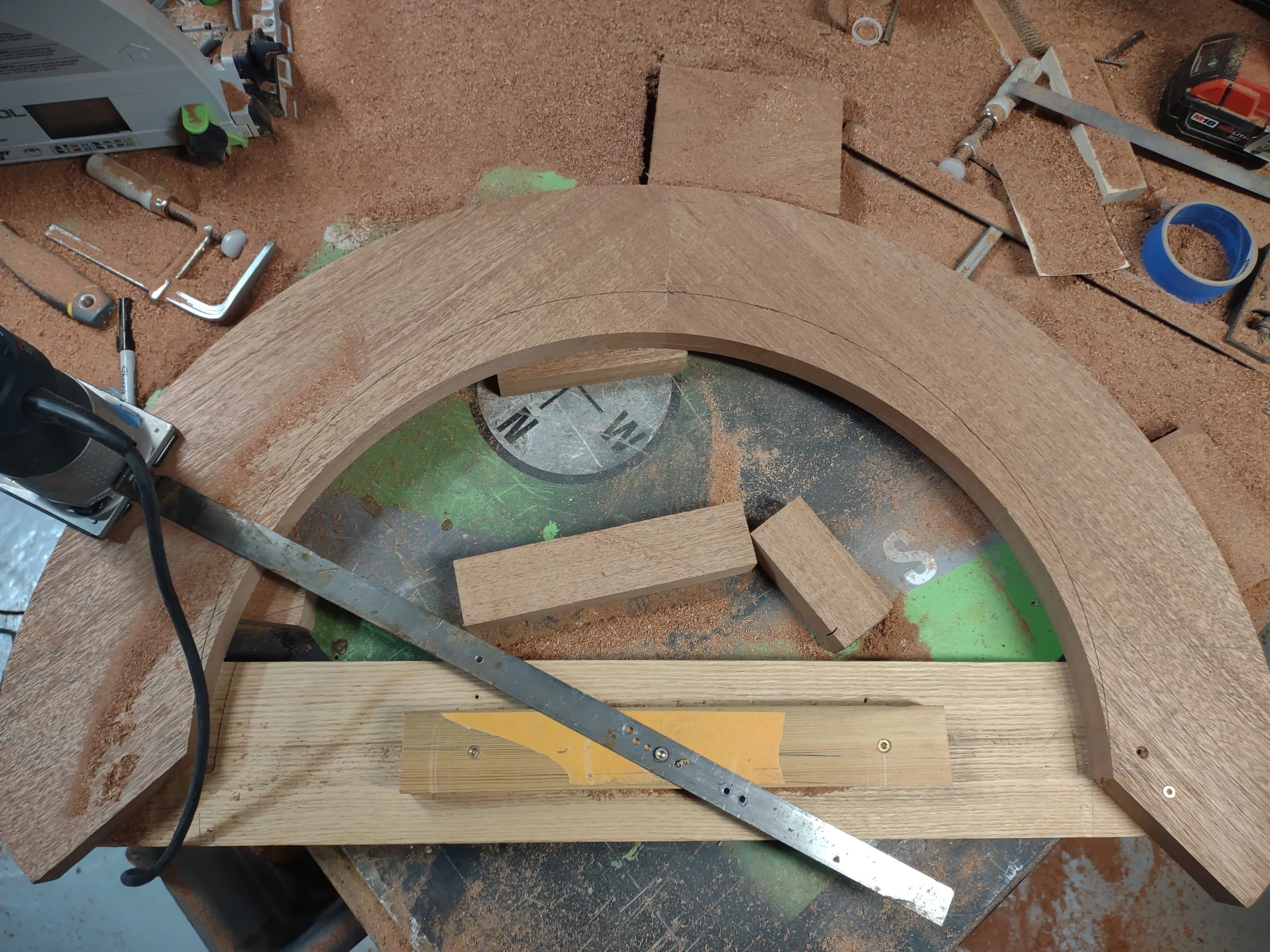 A router on a radial fixture is used to cut the arch.