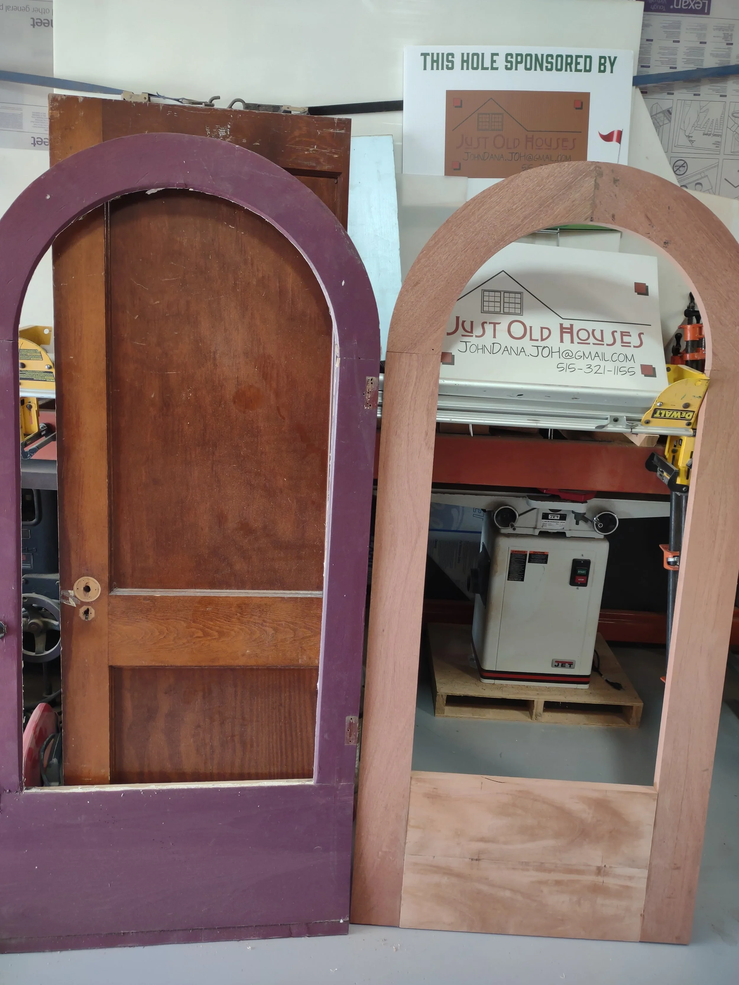 The existing door next to the unfinished replacement.