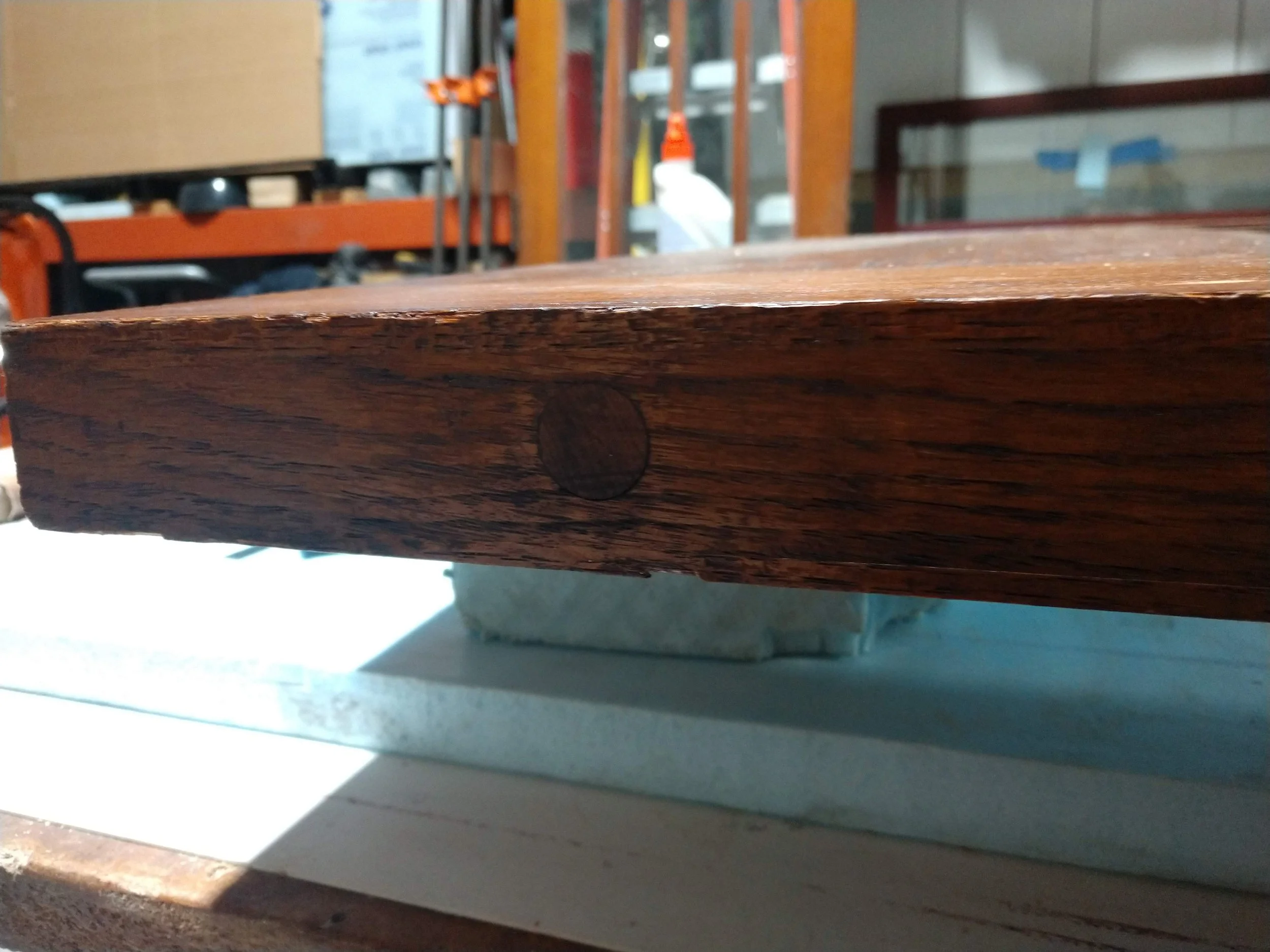 Rather than a complete disassembly and risk damaging the nearly perfect original finish, it was decided to add dowel pins to repair the leaves.